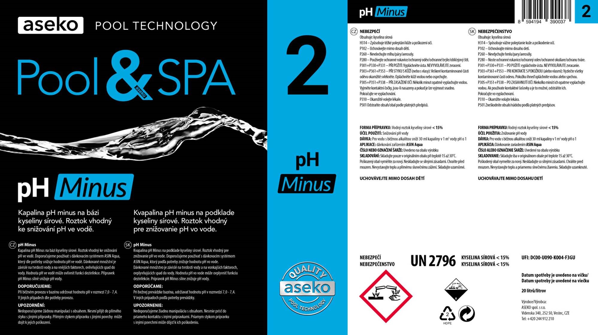 pH MINUS je tekutý prípravok určený na efektívne znižovanie hodnoty pH bazénovej vody. Správne vyvážené pH je kľúčové pre účinnosť bazénovej chémie, komfort pri kúpaní aj dlhšiu životnosť bazénovej technológie.