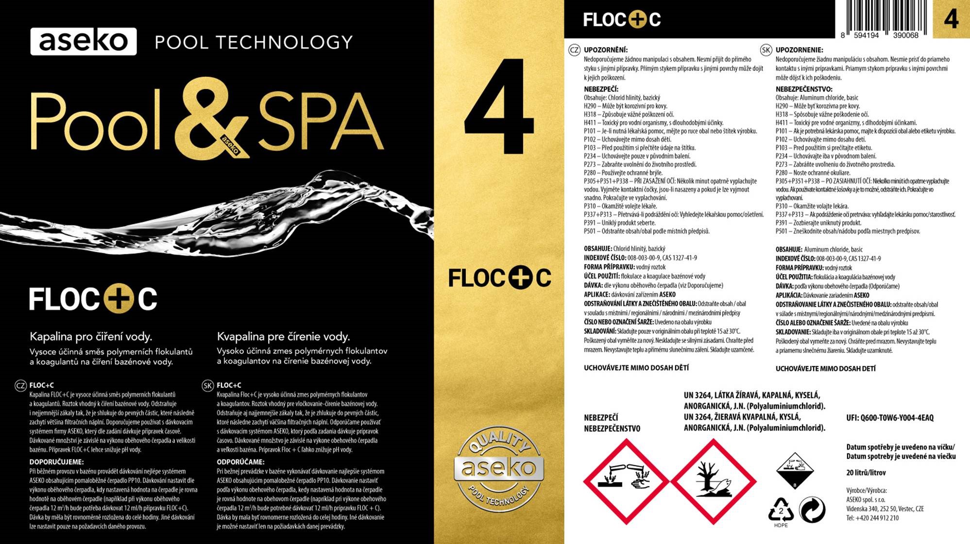 FLOC+C je profesionálny prípravok určený na flokuláciu a koaguláciu bazénovej vody, ktorý účinne odstraňuje aj jemný zákal. Voda sa čistí tak, že sa nečistoty zhŕňajú do pevných vločiek, ktoré sa zachytia vo filtračnom zariadení. Výsledkom je krištáľovo čistá a bezpečná voda pre kúpanie.