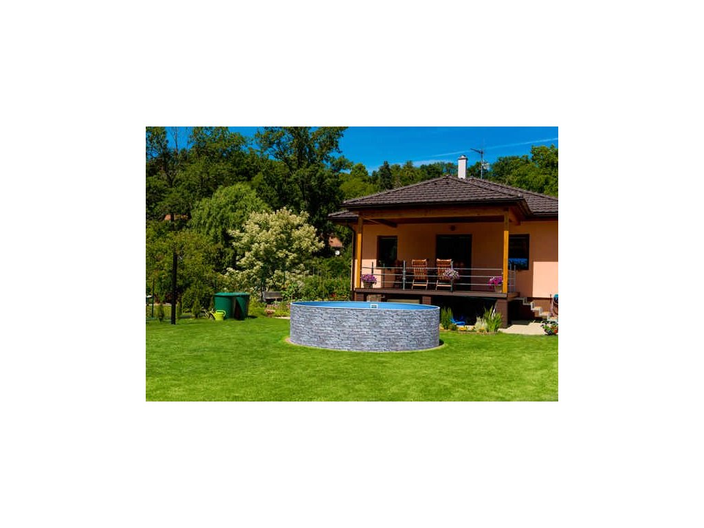 Azuro Stone, kruhový bazén, 4,00x1,20m (imitácia kameňa) má oporné steny z vysoko kvalitného pozinkovaného oceľového plechu s antikoróznou ochranou a špeciálnou plastovou vrstvou. Sedemvrstvová stena výrazne predlžuje životnosť bazéna a zvyšuje jeho stabilitu.