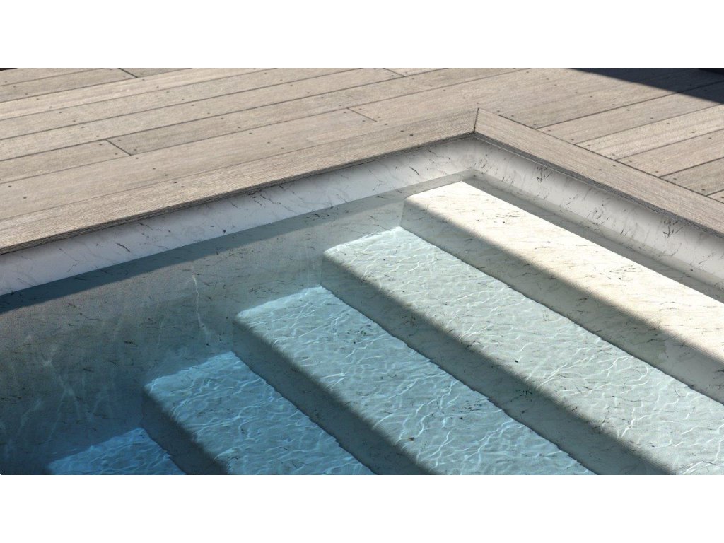 3D mramorový vzor vyzerá pod vodou výraznejšie. Voda vytvára optický efekt, ktorý zvýrazňuje hĺbku reliéfu a dodáva bazénu atraktívny vzhľad.