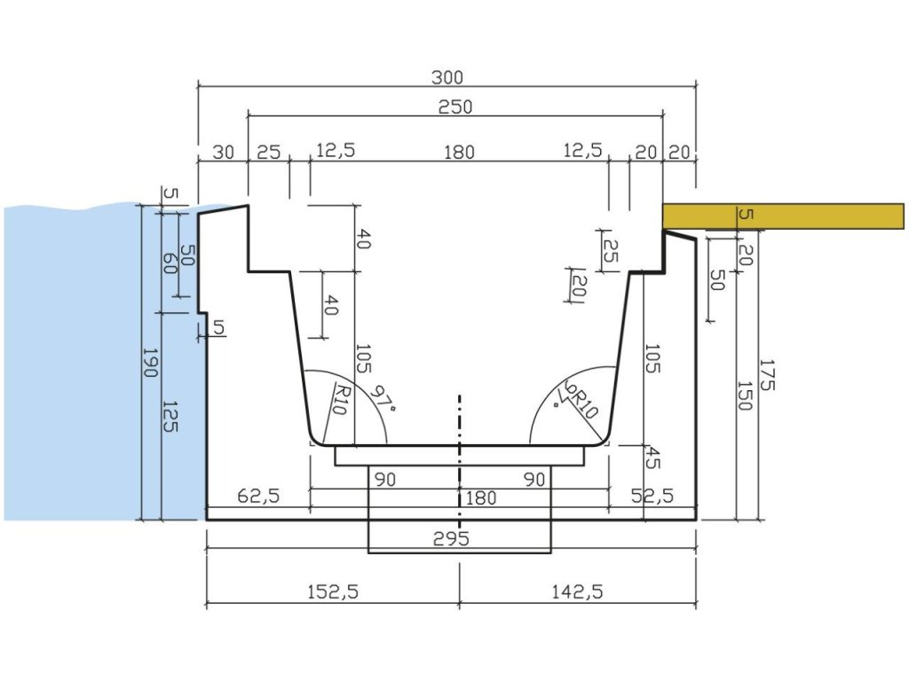 Betónový prelivový žľab 1,0 m je prefabrikovaný prvok určený pre prelivové bazény na osadenie prelivového roštu so šírkou až do 250 mm. Zabezpečuje spoľahlivý odvod prelivovej vody z okraja bazéna do filtračného okruhu.