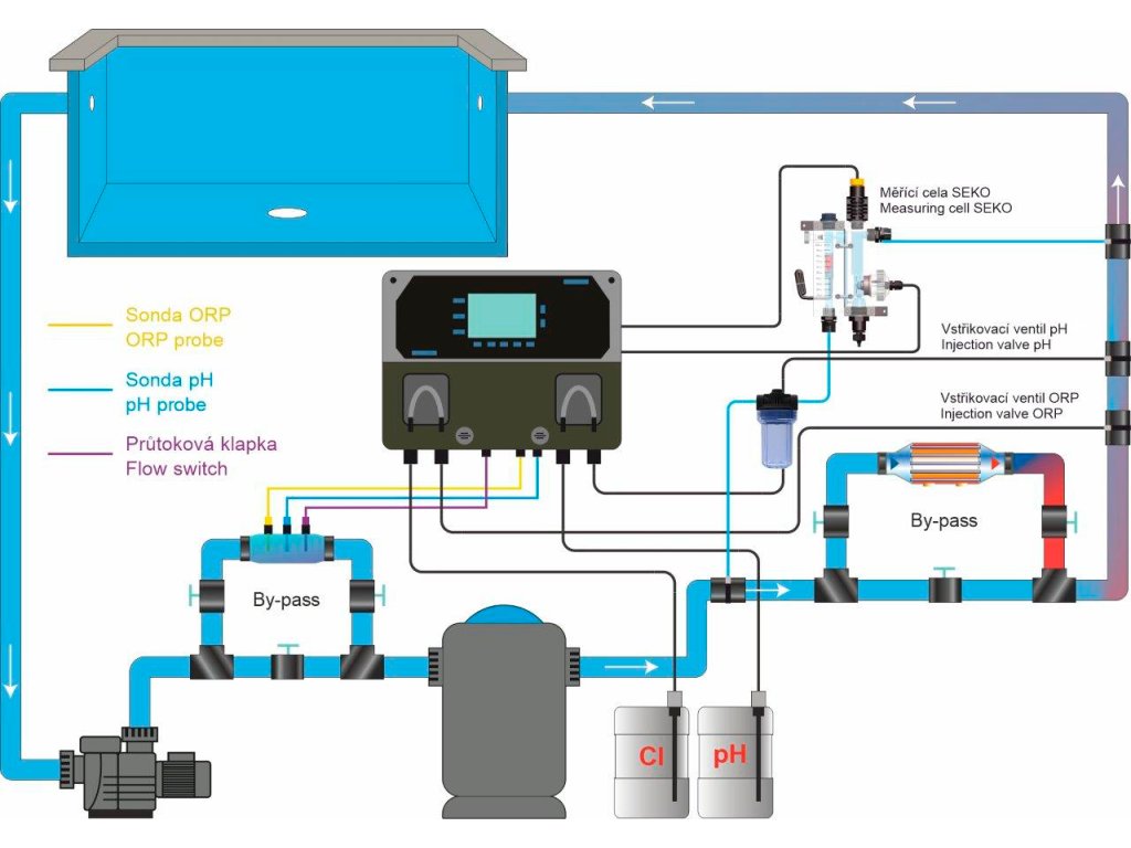Udržiavanie optimálnych hodnôt pH (ideálne 7,0 – 7,4) a voľného chlóru (0,5 – 1,5 ppm) je základom zdravej bazénovej vody. Dávkovacia stanica VA DOS EXACT „SEKO" monitoruje tieto hodnoty a podľa potreby upravuje chemické zloženie vody, čím: