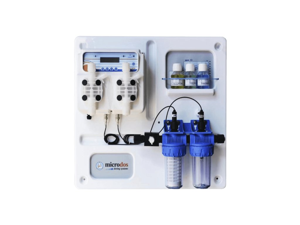 Microdos MP Dual Panel predstavuje profesionálne riešenie pre automatické meranie a reguláciu hodnôt pH a Redox (ORP) v bazénovej vode. Tento kompaktný panel kombinuje meraciu jednotku, dávkovacie čerpadlá a príslušenstvo v jednom celku, čím umožňuje rýchlu a jednoduchú inštaláciu bez potreby dodatočnej montáže.