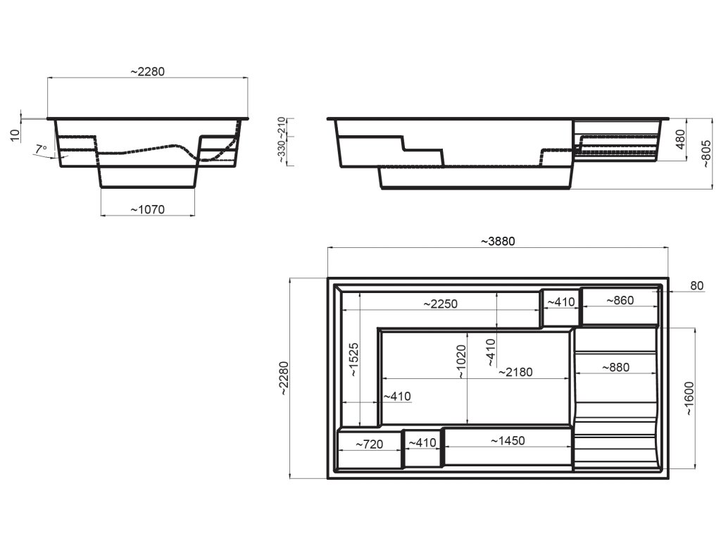 - vonkajšie rozmery (d x š x h): 3,88 x 2,28 x 0,80 m