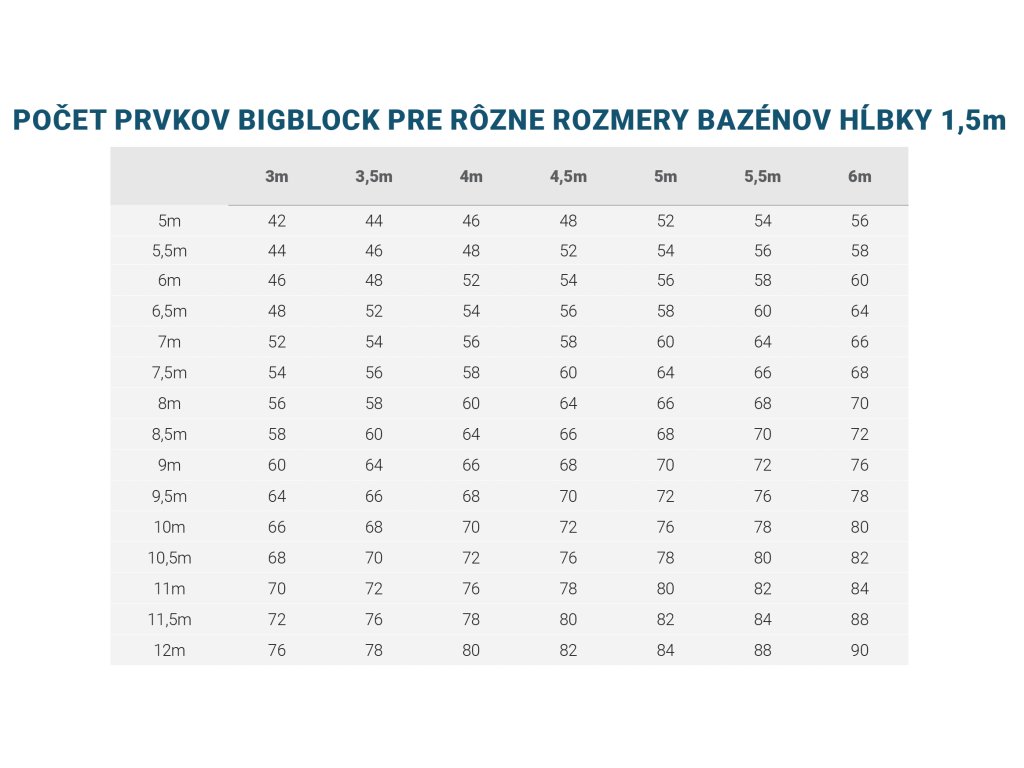 Počet prvkov BigBlock pre rôzne rozmery bazénov (hĺbka 1,5m)