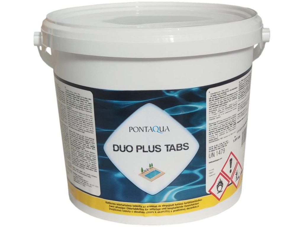 Pontaqua Duo tabs (200g) - 3kg sú technicky pokročilé 200 g dvojfázové tablety určené na zjednodušenie chlórovej údržby bazénovej vody. Každá tableta sa skladá z dvoch častí: modrej (na báze dichlórizokyanurátu sodného – SDIC), ktorá sa rozpúšťa rýchlo a zabezpečuje okamžitú šokovú dezinfekciu, a bielej (na báze kyseliny trichlórizokyanurovej – TCCA), ktorá sa rozpúšťa pomaly a poskytuje nepretržitú dezinfekciu po dobu 10 až 14 dní.