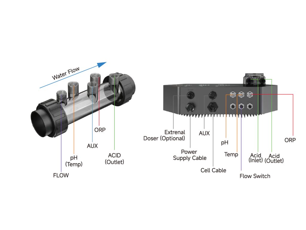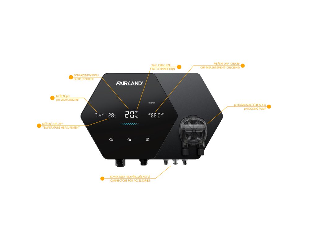 Integrované senzory pH, teploty a prietoku (s možnosťou doplniť senzor ORP) umožňujú inteligentnú, takmer plne automatizovanú úpravu vody. Zabudované dávkovacie čerpadlo sa stará o automatickú reguláciu pH a dávkovanie kyseliny, takže manuálny zásah je minimálny. Ovládanie zabezpečuje dotykový displej a Wi-Fi pripojenie s možnosťou správy cez mobilnú aplikáciu.