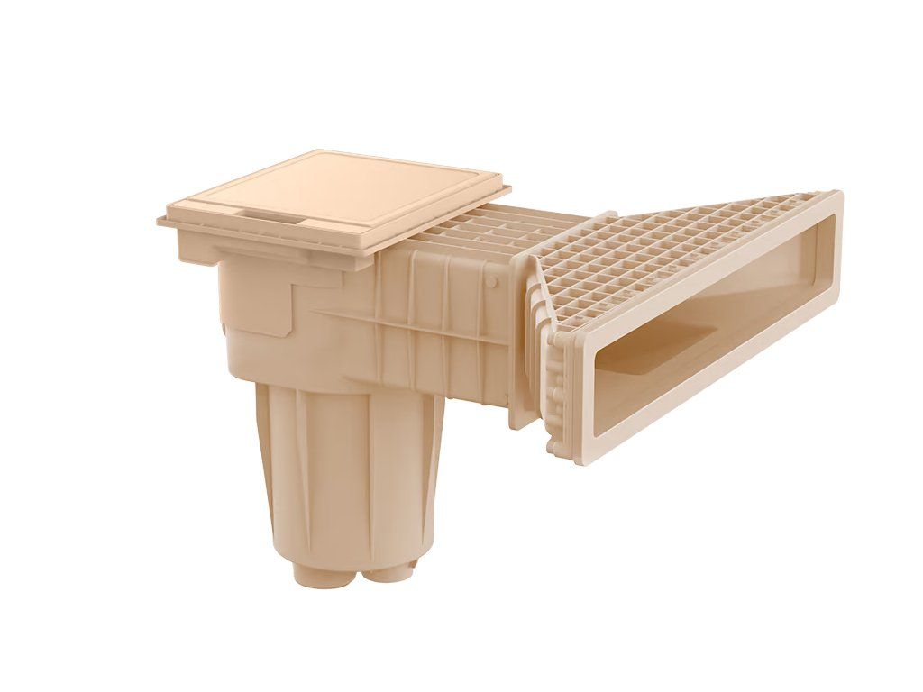 Skimmer X600-PRO, pre fóliové bazény, s mosadznými zástrekmi – pieskový je veľkokapacitný skimmer určený pre fóliové bazény, vyrobený z vysoce kvalitného ABS s UV ochranou. Telo skimmera je osadené mosadznými zástrekmi a súčasťou je košík s objemom 3 l na zachytávanie hrubých nečistôt.