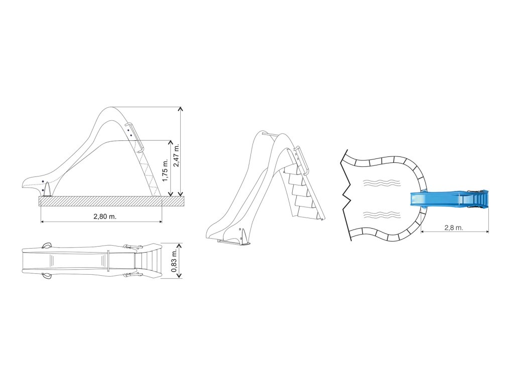 Šmykľavka so schodmi a chrličom vody, rovná, 1,75m je robustná bazénová šmykľavka určená na zábavu pri bazéne aj bezpečný vstup do vody. Chrliče umiestnené na bezpečnostnom zábradlí udržiavajú šmykľavku neustále mokrú a rýchlu, čo zvyšuje komfort pri šmýkaní.