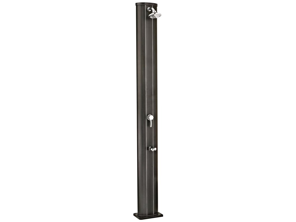 Hliníková čierna solárna sprcha s 40 l zásobníkom a chrómovou batériou na teplú a studenú vodu. Súčasťou je praktický oplach nôh pre pohodlné sprchovanie pri bazéne.