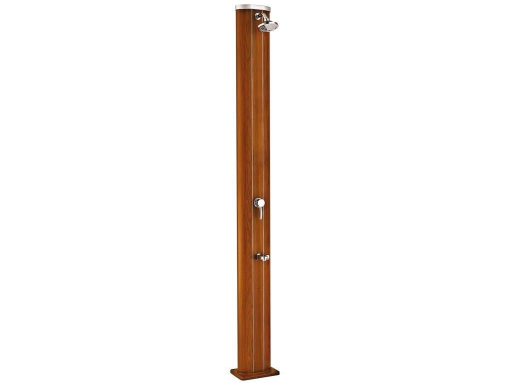 Hliníková solárna sprcha s dreveným vzorom a 40 l zásobníkom. Chrómová batéria na teplú a studenú vodu a praktický oplach nôh pre pohodlné sprchovanie pri bazéne.