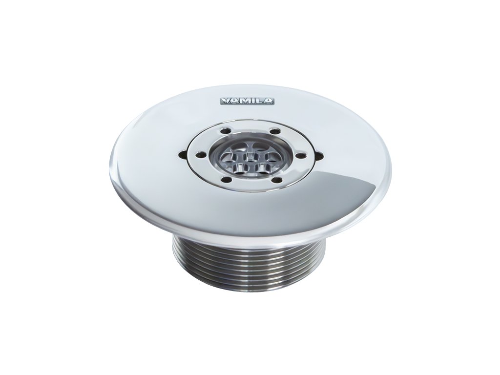 Vtoková tryska VAMILA nerez – zapustená s transparentnou guličkou s priemerom 7 x 6,5 mm a vonkajším závitom 2". Celonerezové vyhotovenie pre čistý vzhľad a odolné napojenie v bazénovej technológii.