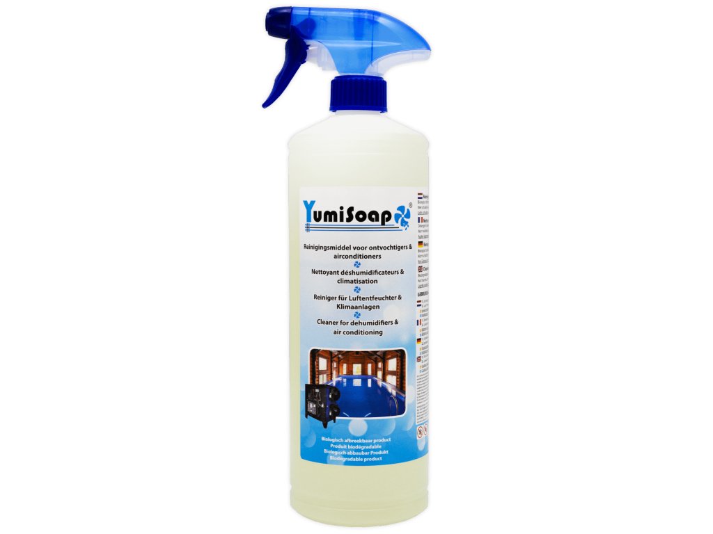 Čistiaci prostriedok Yumisoap je vysokoúčinný, biologicky rozložiteľný sprej určený na dôkladné čistenie a dezinfekciu odvlhčovačov vzduchu, klimatizácií a výmenníkov tepla. Efektívne odstraňuje prach, mastnotu, plesne a baktérie, čím zlepšuje hygienu aj výkon zariadení.